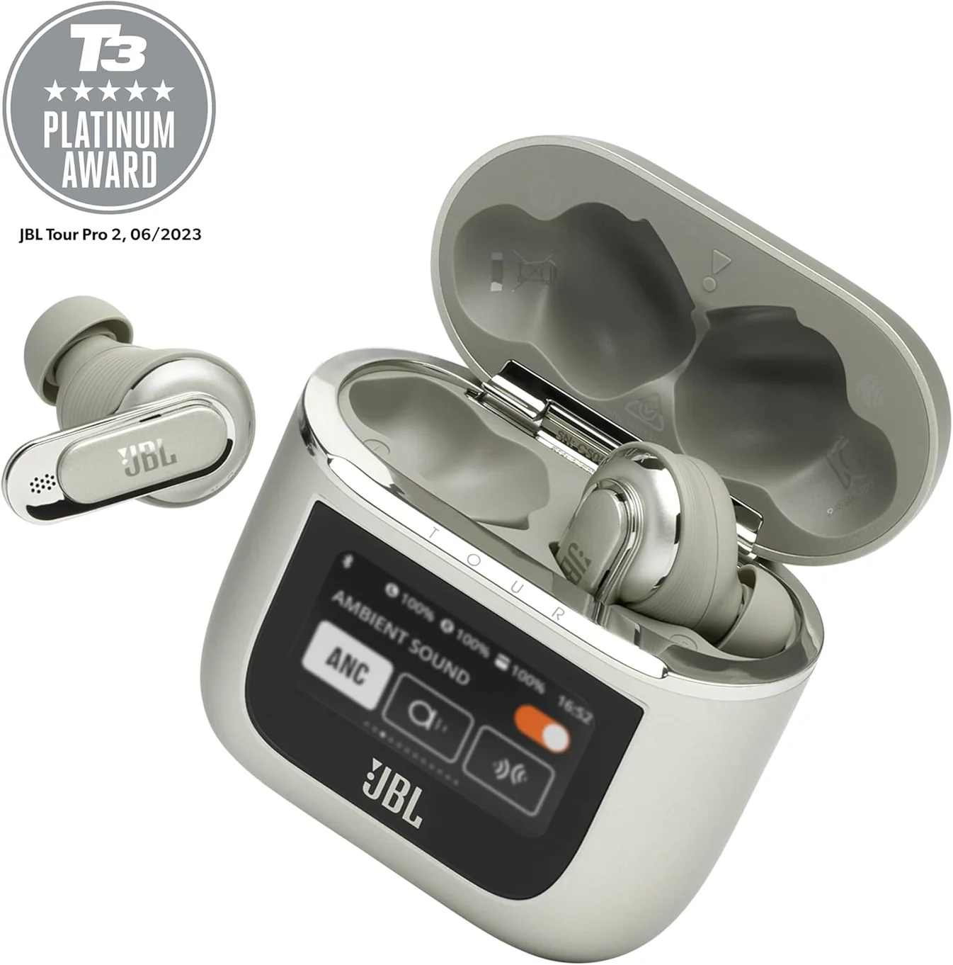 - [Smart Case for Seamless Experience] – Control the earbuds’ settings, manage calls and playback, control your audio setting and battery level and set your alarm without taking out your phone, through the screen of the charging case. Enjoy a truly seamless experience thanks to the JBL Tour Pro 2 unique smart charging case without using your phone or the JBL Headphones App.